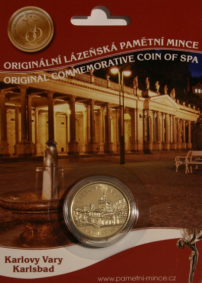 Na blistru je pohled na Karlovy Vary a základní informace o místě v češtině a angličtině.